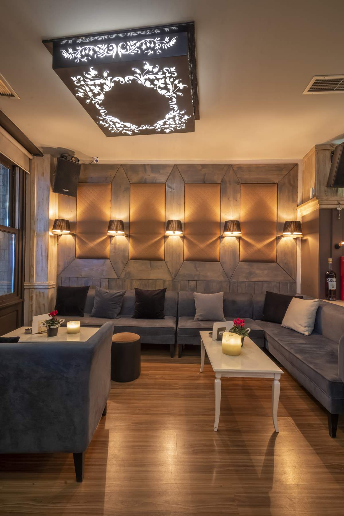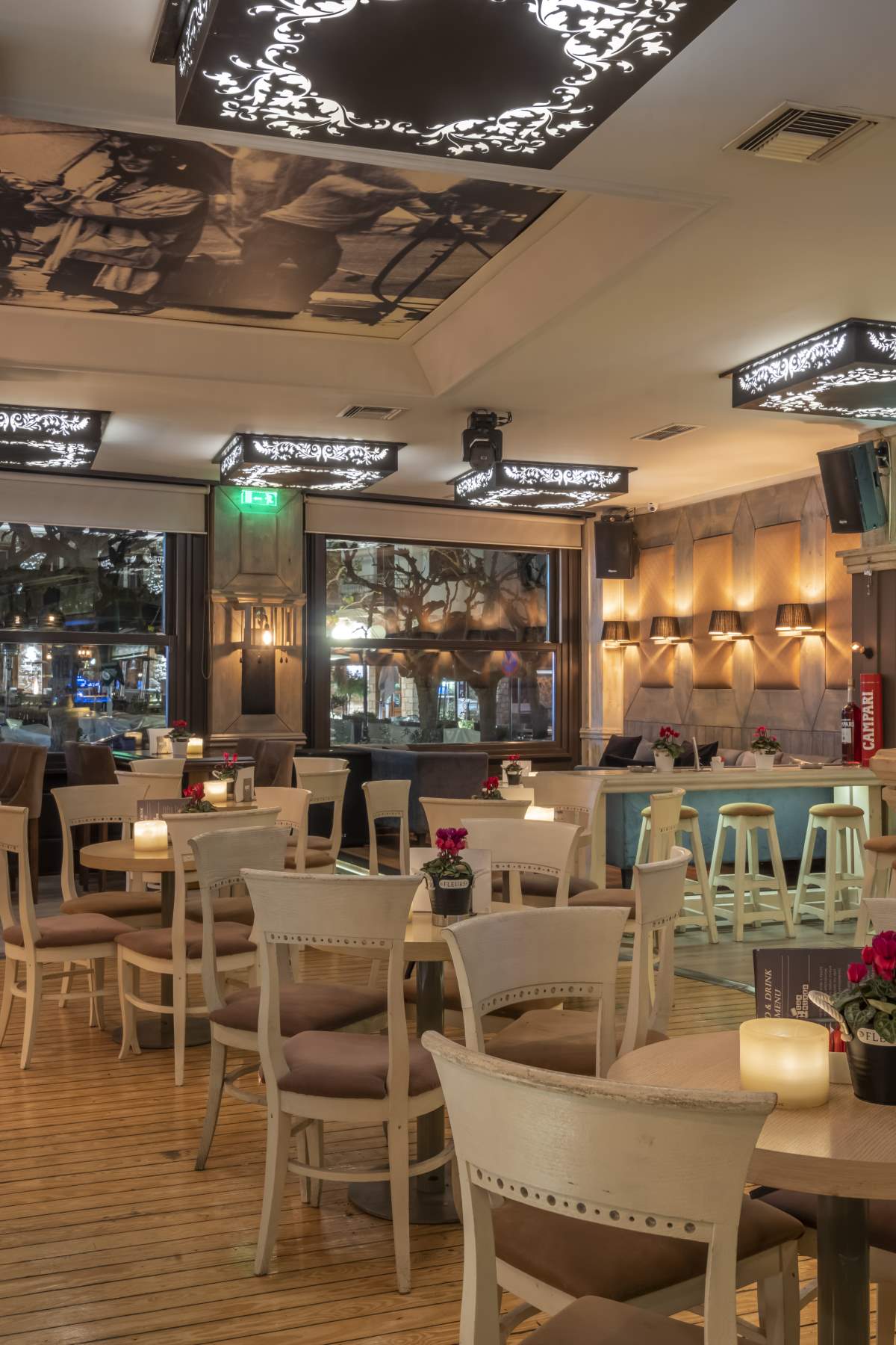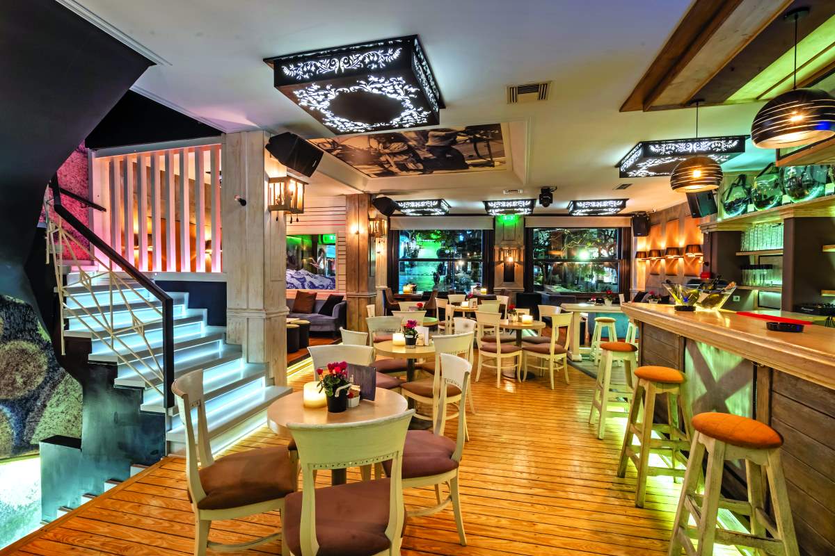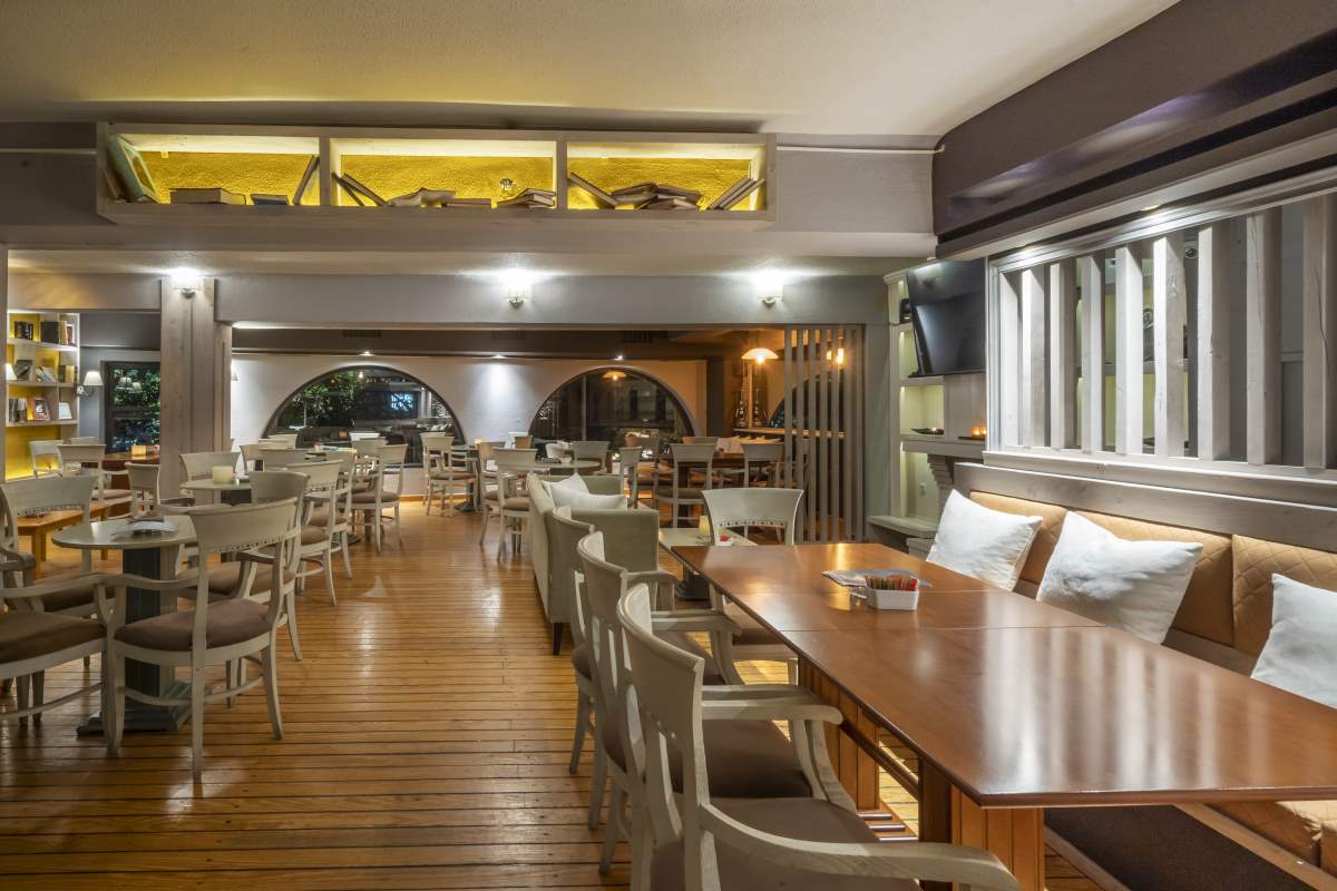 Από την τεράστια τζαµαρία του χαζεύουµε την κεντρική περαντζάδα, την ώρα που τα τραπεζάκια έξω στην πλατεία, θυµίζουν υπαίθριο… σαλόνι!